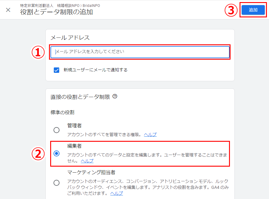 6.権限を割りふるユーザーのメールアドレス(Googleアカウント)を入力して、直接の役割とデータ制限から[編集者]を選択した後、右上の[追加]を押してください