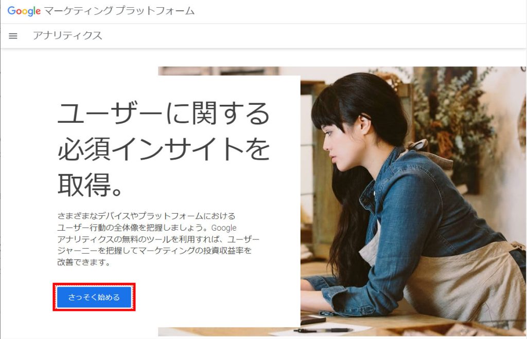 まずはGoogleアカウントにログインした状態でGoogleアナリティクスのサイトから[さっそく始める] を押してください。