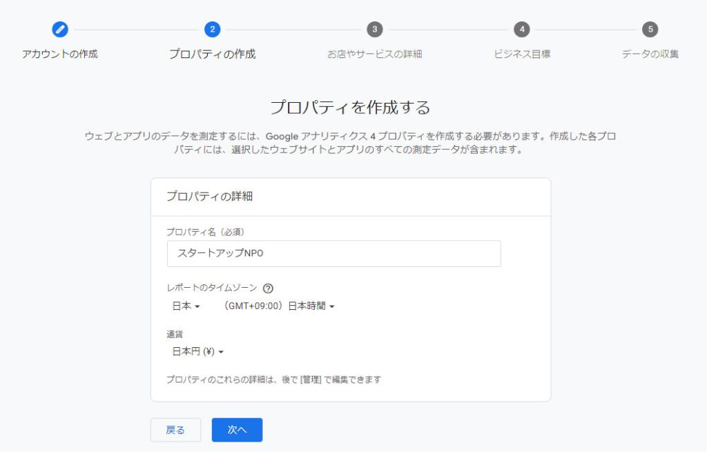 次の「プロパティの設定」画面では、アカウント名と同じで良いと思いますので分かりやすい「プロパティー名」を設定し、「レポートのタイムゾーン」を日本に「通貨」を日本円にします。