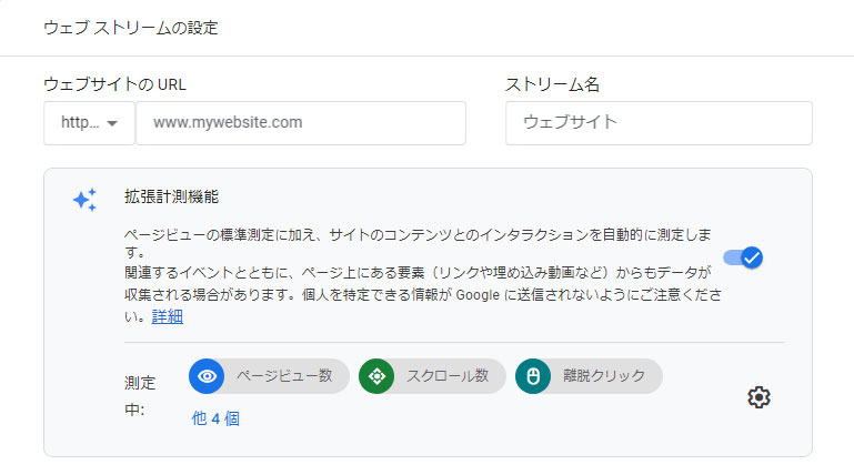 その後はアンケート的な「ビジネスの説明」「ビジネス目標」を回答し、プラットフォームは「ウェブ」を選択します。その後、ウェブストリームの設定画面が表示されましたら、URL名とストリーム名を入力し[作成して続行]を押してください。