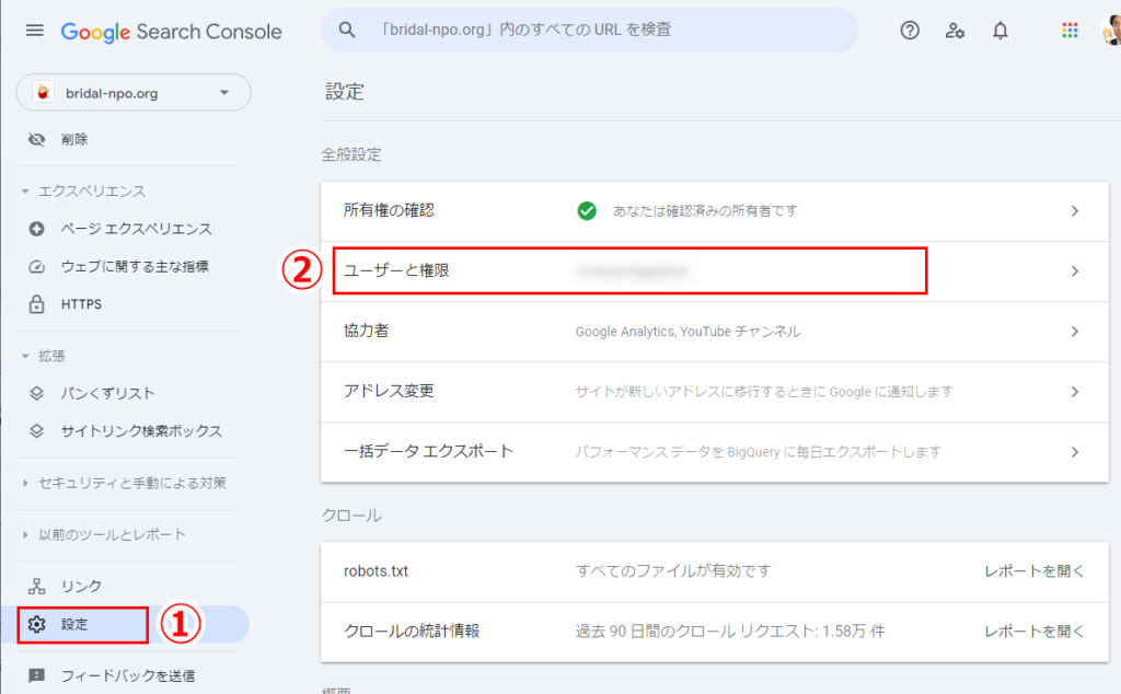 2.サーチコンソール左下の[設定]を押した後、[ユーザーと権限]を選択してください