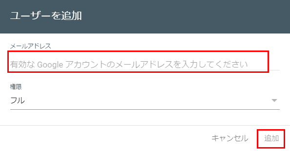 4.上段の赤枠に追加するユーザーのメールアドレス(Googleアカウント)を入力して、[追加]を押してください。(権限は「フル」のまま)