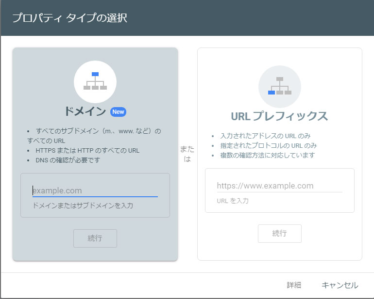 以下の画像が表示されますので右側のURLプレフィックス側に登録するページのアドレス(URL)を入力して[続行]を押してください