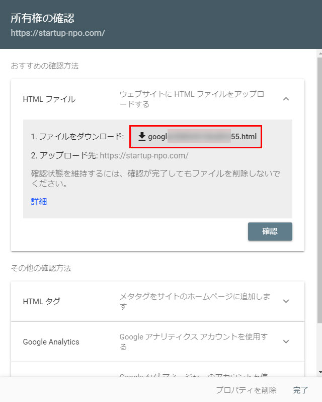 「所有権の確認」画面が表示されるので、一般的にはファイルをダウンロードした後、ダウンロードしたファイルをFTPソフト等でホームページのディレクトリにファイルをアップロードします。Cocoonをご利用の場合は「その他の確認方法」の「HTMLタグ」を選択してください。