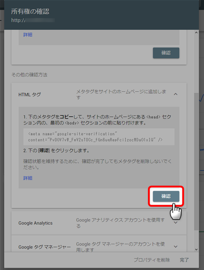 ここからは共通で、最後にサーチコンソールページの「所有権の確認」ダイアログの「確認」ボタンを押して完了です。